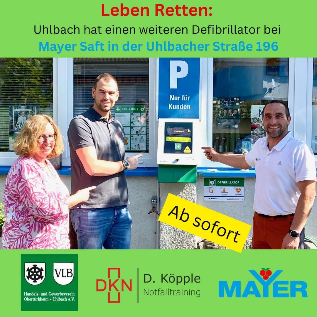 Leben Retten! Seit dieser Woche gibt es einen weiteren Defibrillator in Uhlbach. Der HGV hat in Zusammenarbeit mit Dominik Köpple - Notfalltraining auf dem Parkplatz der Firma Mayer Fruchtsäfte einen weiteren Defibrillator installiert - dieser ist ab sofort einsatzbereit.